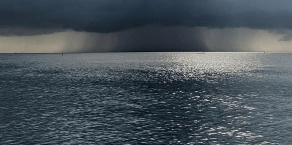I took this picture at the time, from my place on the beach, knowing I’d get closer to that deluge before I was able to find my way out of it, and I captured the whole image, so that I could always have it to remind myself, even above that black sheet of rain, above thick dark clouds, was blue sky and sun.